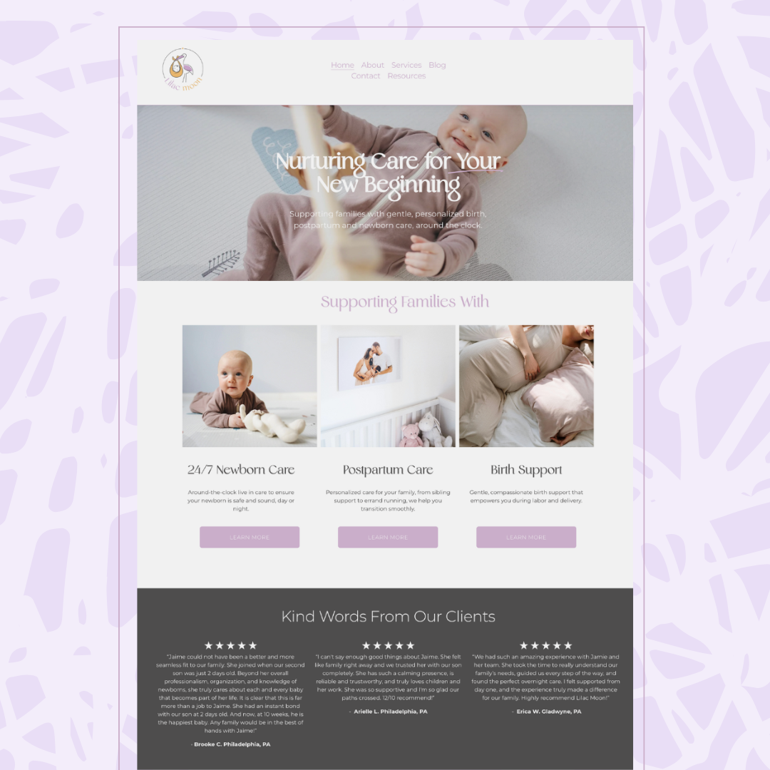 The Lilac Moon brand was designed to feel calm, nurturing, and trustworthy. Soft, muted tones and gentle contrast create a sense of ease while maintaining a polished, professional look. The typography pairs a refined serif with a clean sans-serif, balancing warmth with clarity. Intentional spacing and minimal visual clutter allow the brand to feel grounded and supportive, reflecting the heart of the services while positioning the business as established and credible.