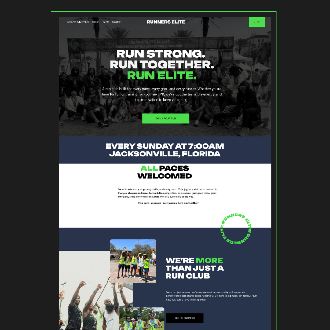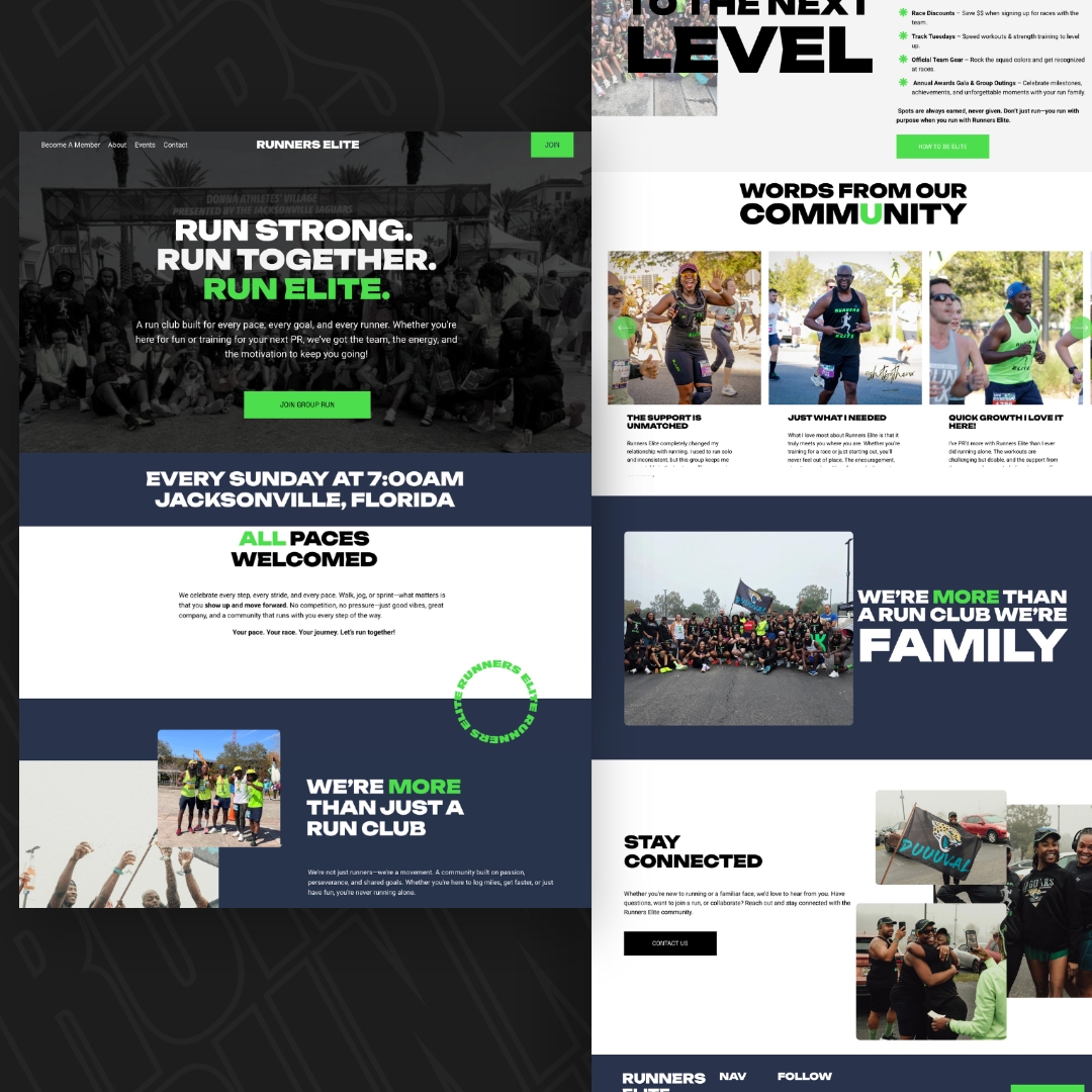 The Runners Elite brand was refined to feel bold, energetic, and unified. The visual direction emphasizes clarity and consistency across platforms, using strong typography and intentional layout to support an active, high-impact community. Branding elements were designed to translate seamlessly from digital to in-person experiences, ensuring the club’s identity feels recognizable, motivating, and cohesive whether online or on the run.